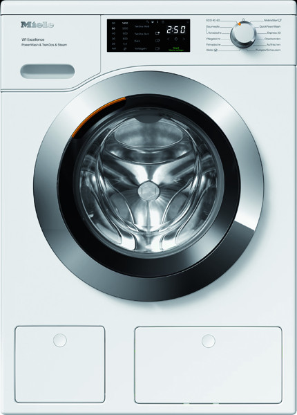 DirectSensor Display, Startvorwahl bis zu 24 Std., Programmablauf-Anzeige, Restzeitanzeige, Summer, PowerWash, TwinDos, CapDosing, SteamCare, Mengenautomatik, Schaumregulierung, Wassermengenzähler, AddLoad (Nachlegen nach Programmstart), Optionen: Kurz, Vorbügeln mit Dampf; Niedrigtemperaturwaschen "kalt" und "20°C", Waschprogramme: QuickPowerWash, Baumwolle, Baumwolle mit Vorwäsche, Pflegeleicht, Feinwäsche, Oberhemden, Wolle (Handwäsche), Express 20, Auffrischen (Dampf), Pumpen/Schleudern, ECO 40-60; AutoClean Einspülkasten, Waterproof-System, Kindersicherung, PIN-Code Verriegelung, optische Schnittstelle, Miele@home, Tür Chrom, ProfiEco Motor, säulenfähig