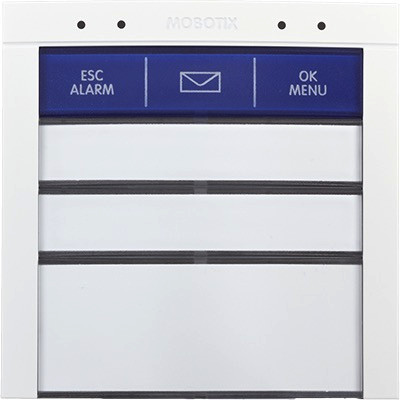 1 mittelgroße und 2 kleine Klingeltasten mit blauer Funktionstaste - Nutzung mit beliebigem BellRFID-Grundmodul (separat bestellbar) - Passend für alle Farbvarianten - Schutzart IP65, -30 bis 50 °C - Kostenfreier Beschriftungsservice: www.mobotix.com > Support - Lieferung mit UV-beständigem Spezialpapier-Einleger