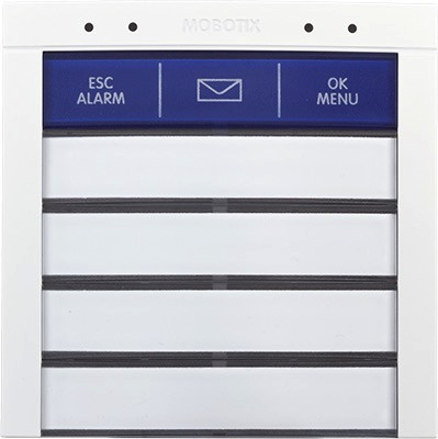 4 kleine Klingeltasten mit blauer Funktionstaste - Nutzung mit beliebigem BellRFID-Grundmodul (separat bestellbar) - Passend für alle Farbvarianten - Schutzart IP65, -30 bis 50 °C - Kostenfreier Beschriftungsservice: www.mobotix.com > Support - Lieferung mit UV-beständigem Spezialpapier-Einleger