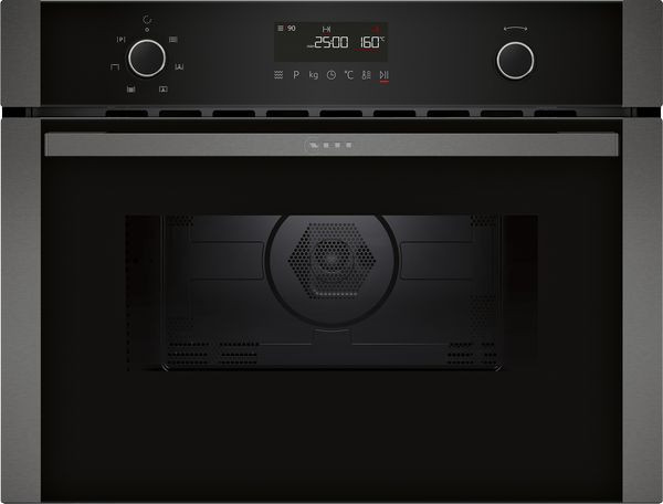 Mikrowelle und Heizart Einbau-Mikrowelle mit Heißluftfunktion mit den Heizarten: Mikrowelle, Heißluft, Thermogrill, Großflächengrill, Warmhalten Max. Leistung: 900 W; 5 Mikrowellen-Leistungsstufen: 90 W, 180 W, 360 W, 600 W, 900 W Temperaturregelung von 40 °C - 230 °C Grill 1.75 kW Grill mit Mikrowellen-Leistungsstufen 90 W, 180 W, 360 W, 600 W kombinierbar Mikrowelle einzeln oder in Kombination nutzbar Garraumvolumen: 44 l Design Graphite-Grey Edition Garraum aus Edelstahl mit Glasboden Reinigung Easy Clean (manuell) (Reinigungshilfe): Leichte Verschmutzungen entfernen mit Wasserdampf und Spülmittel. Komfort LCD-Display Elektronik-Uhr Drehwähler, Starttaste, LED Touch Control Steuerung, Voll versenkbare Bedienknebel Leicht-Bedien-Konzept: besonders einfaches, problemloses Einstellen cookControl15 4 Auftau- und 3 Garprogramme im Mikrowellenbetrieb, 8 Programme für Kombinationsbetrieb Schnellaufheizung: Schnell zur Zieltemperatur ohne höheren Energieverbrauch LED-Innenbeleuchtung Edelstahl-Lüfterrad Klapptür Profilgriff Bedienung über Sensortasten Zubehör Rost Umwelt und Sicherheit Automatische Sicherheitsabschaltung Türkontaktschalter Kühlgebläse Technische Info Länge des Anschlusskabels: 180 cm Gesamtanschlusswert Elektro: 3.35 kW Nennspannung: 220 - 230 V Zum Einbau in einen Hochschrank Maße Gerätemaße (HxBxT): 454 x 594 x 570mm Nischenmaße (HxBxT): 458 mm x 560 mm x 550 mm „Maße und Einbauhinweise zu diesem Gerät gemäß technischer Zeichnung beachten“