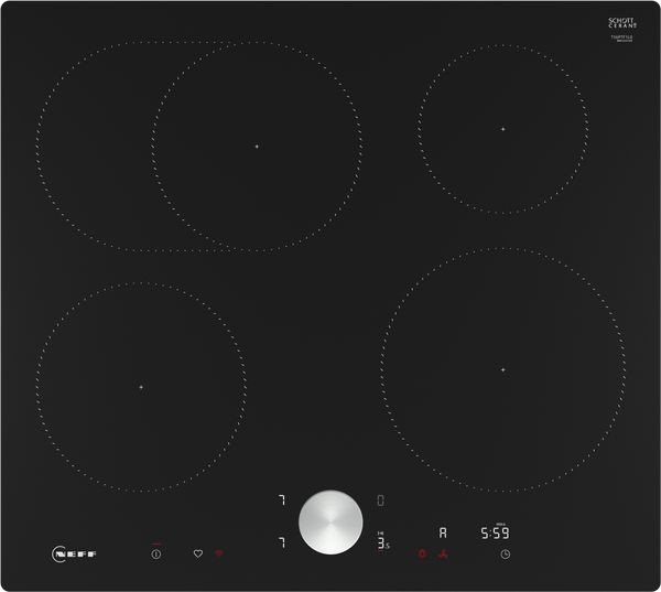 60 cm: Platz für 4 Töpfe oder Pfannen Flexibilität der Kochzonen Bräterzone: Extra zuschaltbare Kochzone für großes Bratgeschirr Kochzone vorne links: 180 mm, 2 kW (maximale Leistung 3.1 kW) Kochzone hinten links: 180 mm, 280 mm, 2 kW (maximale Leistung 3.1 kW) Kochzone hinten rechts: 145 mm, 1.6 kW (maximale Leistung 2.2 kW) Kochzone vorne rechts: 210 mm, 2.5 kW (maximale Leistung 3.7 kW) Benutzerfreundlichkeit Zweifarbiges Display (weiß/rot): leicht zu erkennen, welche Funktion aktiviert ist. Favourite Taste: Mit einer konfigurierbaren Taste direkt auf Lieblingsfunktionen zugreifen. 17 Leistungsstufen: Stellen Sie die Hitze mit 17 Leistungsstufen (9 Hauptstufen und 8 Zwischenstufen) präzise ein. Warmhalte-Funktion, wählbar über Favourite Taste/Home Connect App (voraussichtliche Verfügbarkeit in Q4/2024 über Software-Update für mit Home Connect verbundene Geräte): Warmhalten von Speisen bei voreingestellter niedriger Leistungsstufe. Switch Off Timer: schaltet die Kochzone am Ende der eingestellten Zeit aus (z. B. für gekochte Eier). Alternativ Wecker: Ein Signal ertönt am Ende der eingestellten Zeit (z. B. beim Pastakochen). Die Lautstärke der Signaltöne kann an die persönlichen Vorlieben und Bedürfnisse angepasst werden. Zeitersparnis und Effizienz Powerstufe für Töpfe: Mit 50 % mehr Leistung z. B. Wasser schneller zum Kochen bringen als auf höchster Leistungsstufe. Powerstufe für Pfannen, wählbar über Favourite Taste/Home Connect App (voraussichtliche Verfügbarkeit in Q4/2024 über Software-Update für mit Home Connect verbundene Geräte): Erhitzt Pfannen schneller als auf höchster normaler Leistungsstufe und schützt gleichzeitig die Pfannenbeschichtung. Quick Start Funktion: Beim Einschalten wählt das Kochfeld automatisch die Kochzone aus, auf dem im ausgeschaltetem Zustand Kochgeschirr aufgesetzt wurde. Restart Funktion: Im Falle von unbeabsichtigtem Ausschalten des Kochfeldes bleiben alle Einstellungen erhalten, wenn Sie innerhalb von 4 Sekunden wieder einschalten. Konnektivität Home Connect Funktion (WLAN): Überprüfen Sie, ob das Kochfeld auch dann ausgeschaltet ist, wenn Sie nicht zu Hause sind, und suchen Sie in der Home Connect-App nach Rezepten oder zusätzlichen Funktionen. cookConnect System (mit passender Dunstabzugshaube): Aktiviert den Dunstabzug beim Kochen automatisch, dank der WiFi-Verbindung von Kochfeld und geeignetem Dunstabzug. Sensorlose Automatik: ja, nach Software-Update. Die Dunstabzugshaube passt die Leistungsstufe automatisch an, da das Kochfeld kontinuierlich Kochdaten liefert (mit passender Dunstabzugshaube und verbundenem Home Connect-Konto). Externer Trigger per MyButton: Öffnen Sie das intelligente Universum von Ihrem Kochfeld aus (Partnerservice erforderlich). Aktualisierbares Gerät (verfügbar mit verbundenem Home Connect-Konto): Halten Sie das Gerät immer auf dem neuesten Stand der Software. Design Ohne Rahmen, zum flächenbündigen Einbau Sicherheit 2-stufige Restwärmeanzeige je Kochzone: Zeigt an, welche Kochzonen noch heiß oder warm sind. Kindersicherung: Verhindert eine unbeabsichtigte Aktivierung des Kochfeldes. Pause-Funktion: Unterbrechen Sie das Kochen, z. B. um die Haustür zu öffnen. Hauptschalter: Alle Kochzonen auf einmal ausschalten. Automatische Sicherheitsabschaltung: Aus Sicherheitsgründen schaltet das Kochfeld nach einer voreingestellten Zeit ohne Interaktion automatisch ab (einstellbar). Installation Maße des Gerätes (HxBxT mm): 56 x 572 x 512 Erforderlicher Ausschnitt für die Installation (HxBxT mm): 56 x 576 x 516 Minimale Arbeitsplattenstärke: 16 mm Gesamtanschlusswert: 7400 W Die Powermanagement Funktion: Begrenzen Sie bei Bedar