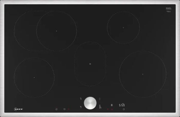 4 Induktions-Kochzonen mit Topferkennung, davon 1 Bräterzone und 1 Warmhaltezone, Powerstufe für alle Kochzonen, 2 stufige Restwärmeanzeige je Kochzone, elektronische Twistpad-Steuerung mit abnehmbarem magnetischen Drehwähler, zweifarbiges Display (weiß/rot), per HC App/MyButton: Warmhalten von Speisen bei voreingestellterniedriger Leistungsstufe, 17 Leistungsstufen, Quick Start, Restart Funktion, Timer mit Abschaltfunktion, Wecker, automatische Sicherheitsabschaltung, umlaufender Rahmen, kochfeldbasierte Haubensteuerung (mit passendem Dunstabzug):Aktiviert den Dunstabzug beim Kochen automatisch, dank derWiFi-Verbindung von Kochfeld und Home Connect Dunstabzug(verbunden mit einem Home-Connect-Konto)