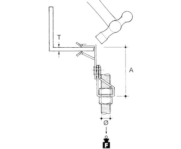 E-Klips, Flanschkralle mit Winkelabhänger, zum Aufschlagen mit dem Hammer auf verschiedenste Trägerflansche, für Gewindestababhängungen. Abmessungen (ca. Maße) für Flanschstärke T : 3 - 8 mm für Anschlussgewindestab : M 6 Abstand zur Flanschoberfläsche A : 46 mm Tragfähigkeit F : 0,68 kN Werkstoff : Stahl, mechanisch verzinkt/passiviert nach DIN EN ISO 9227