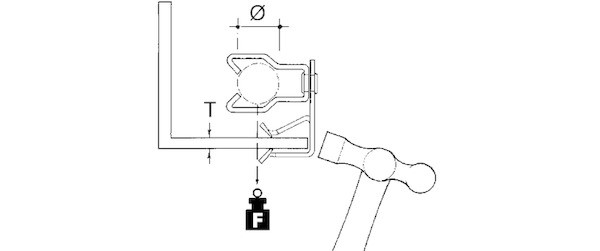 E-Klips, Flanschkralle mit Rohrclip, zum Aufschlagen mit dem Hammer auf verschiedenste Trägerflansche, Rohrclip an Flanschkralle drehbar, zur Verlegung der Rohre innerhalb der Trägerprofile, für Rohrabhängung. Abmessungen (ca. Maße) für Flanschstärke T : 8 - 14 mm Aufschlagtiefe B : 20,3 mm für Rohr-Ø : 22 - 29 mm Tragfähigkeit F : 0,07 kN Werkstoff : Stahl, mechanisch verzinkt/passiviert nach DIN EN ISO 9227
