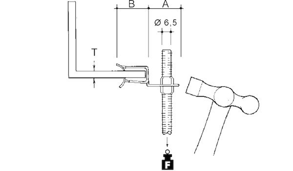E-Klips, Flanschkralle 180°, zum Aufschlagen mit dem Hammer auf verschiedenste Trägerflansche, für Gewindestababhängung. Abmessungen (ca. Maße) für Flanschstärke T : 14 - 20 mm Aufschlagtiefe B : 20,3 mm Laschenabstand zur Flanschkante A : 26,6 mm Anschlusslochung : Ø 6,5 mm Tragfähigkeit F : 0,2 kN Werkstoff : Stahl, mechanisch verzinkt/passiviert nach DIN EN ISO 9227