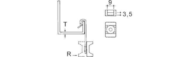 E-Klips, Flanschkralle mit Anschlussstück, zum Aufschlagen mit dem Hammer auf verschiedenste abgewinkelte Trägerflansche, mit an der Vorderseite angebrachtem Anschlussstück aus Kunststoff für die Befestigung von Kabel und Leitungen, Anschlussstück halogenfrei. Abmessungen (ca. Maße) für Kabelbinder : = Breite 9 mm x Höhe 3,5 mm für Flanschstärke T : 1,5 - 5 mm Werkstoff Flanschkralle : Stahl, mechanisch verzinkt/passiviert nach DIN EN ISO 9227 Werkstoff Anschlussstück : PA (Polyamid)