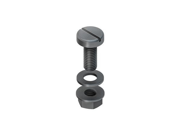 Flachkopfschraube ähnlich DIN EN ISO 1580, einschließlich Flanschmutter und Unterlegscheibe ähnlich DIN EN ISO 7089, halogenfrei. Abmessungen (ca. Maße) Gewinde : M 8 Gewindelänge L : 20 mm Schraubenanzugsmoment max. : 3 Nm Werkstoff : PA (Polyamid)