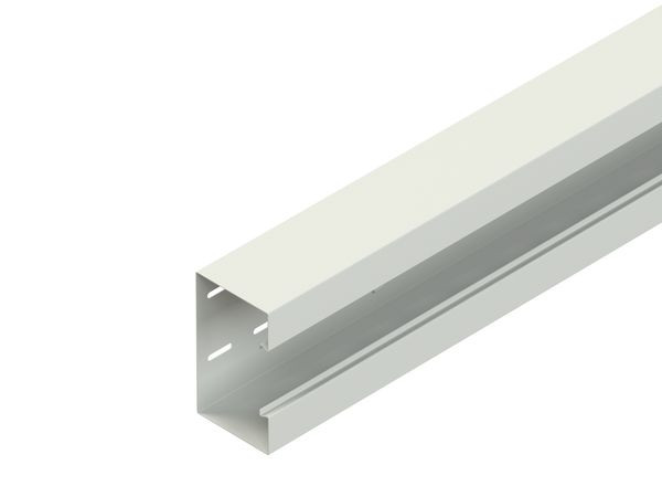 Gerätekanalunterteil, einzügig symmetrisch, mit Schlaufen und rückwärtiger Befestigungslochung zur flexiblen Montage auf Wand oder Wandkonsole, durchgehende Schlaufen zur Aufnahme von Trennprofilen im Rückenteil, Sichtflächen in RAL Farbton gemäß Herstellerkatalog elektrostatisch pulverbeschichtet, Gerätemontage im Leitungszug mit einrastbarer Gerätedose für Einbauprogramme mit 80 mm Abdeckrahmen und 60 mm Befestigungsspur, Geräteeinbau ohne Lochblenden, einschließlich 3 Kabelhalteklammern GKF 78 je 2 m Lieferlänge, für den Potentialausgleich zwei Stoßstellenverbinder GSVA... je Stoßstelle, bitte gesondert bestellen. VDE zertifiziert! Bei der Montage ist darauf zu achten, dass die Schlaufenöffnungen nach oben zeigen. Um einen festen Sitz des Deckels zu erzielen, müssen die Kabelhalteklammern GKF... im Abstand von 0,6 m - 0,7 m im Kanalunterteil eingesetzt werden. Abmessungen (ca. Maße) Höhe H x Tiefe T : 170 x 70 mm Deckelöffnung : 78 mm zweireihige horizontale Rückenlochung : 7 x 33 mm mittiger Lochabstand : 62,5 mm Reihenabstand : 75 mm vertikale Rückenlochung : 7 x 33 mm mittiger Lochabstand : 500 mm Schlaufenabstand RasterMaße : 250 mm Lieferlänge L : 2000 mm Nutzbarer Querschnitt : 10652 mm² Farbton : verkehrsweiß RAL : 9016 (ähnlich) Werkstoff : Stahl, bandverzinkt nach DIN EN 10346