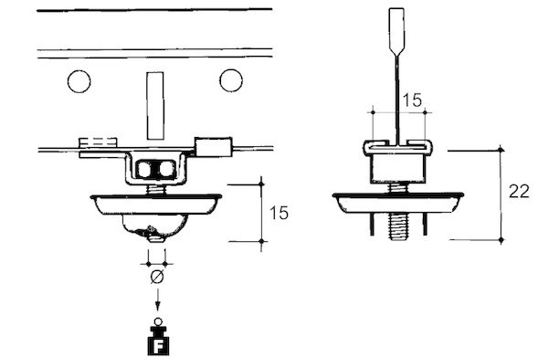 E-Klips, T-Klemme, mit Gewindeanschluss für die Blech-Randmutter XM-6 bitte gesondert bestellen, zur Befestigung an Deckenprofilen. Abmessungen (ca. Maße) Deckenprofilbreite : 15 mm Höhe bis Deckenprofilfläche : 22 mm Gewinde : M 6 Anschlussgewindelänge A : 15 mm Tragfähigkeit F : 0,22 kN Werkstoff : Stahl, lackiert Farbton : weiß