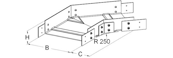 GFK-Bogen 45°, gepresst, mit ungelochten Seitenholmen, mit integrierten gelochten Verbinderlaschen und mit querverlaufenden Verstärkungen (5 mm), zur Herstellung von 45° horizontal abgewinkeltem Kabelrinnenverlauf, anteilmäßiges Befestigungszubehör bitte gesondert bestellen, halogenfrei. Bei der Montage ist darauf zu achten, dass der Bogen an jedem Kabelrinnenzugang mit Auslegern unterstützt wird. Ist die Breite > 400 mm, sollte eine zusätzliche mittlere Unterstützung vorgesehen werden. Um eine ordnungsgemäße Montage zu gewährleisten, müssen die Verbinder an jedem Kabelrinnenzugang mit 2 FKM 6X16 E4 verschraubt sein (bitte gesondert bestellen). Artikel in verschiedenen Harzmischungen erhältlich. Verwendung für : GFK-Kabelrinne KK 80... GFK-Kabelrinne KKL 80... Abmessungen (ca. Maße) H x B : 80 x 395 mm Innenholmradius R : 250 mm Werkstoff : UP-GF (glasfaserverstärkter Polyester) Farbton : kieselgrau RAL : 7032 (ähnlich)