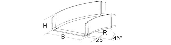 GFK-Bogen 45°, gepresst, mit ungelochten Seitenholmen und angeformtem Verbinder, zur Herstellung von 45° horizontal abgewinkeltem Kabelrinnenverlauf, anteilmäßiges Befestigungszubehör bitte gesondert bestellen, halogenfrei. Bei der Montage ist darauf zu achten, dass der Bogen an jedem Kabelrinnenzugang mit Auslegern unterstützt wird. Um eine ordnungsgemäße Montage zu gewährleisten, müssen die Verbinder an jedem Kabelrinnenzugang mit 2 FKM 6X20 E4 verschraubt sein (bitte gesondert bestellen). Artikel in verschiedenen Harzmischungen erhältlich. Verwendung für : GFK-Kabelrinne KP 50... GFK-Kabelrinne KPL 50... Abmessungen (ca. Maße) H x B : 50 x 100 mm Innenholmradius R : 100 mm Werkstoff : UP-GF (glasfaserverstärkter Polyester) Farbton : kieselgrau RAL : 7032 (ähnlich)