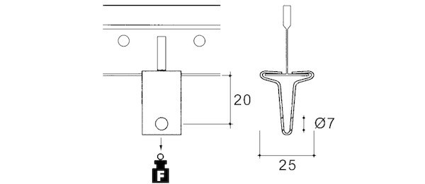 E-Klips, T-Blechabhänger, zur Befestigung an Deckenprofilen, mit Anschlusslochung, für Seil- und Kettenabhängung. Abmessungen (ca. Maße) Deckenprofilbreite : 25 mm Befestigungslochung : Ø 7 mm mittige Lochabstand bis Deckenprofilfläche : 20 mm Tragfähigkeit F : 0,18 kN Werkstoff : Stahl, galvanisch verzinkt/chromatiert nach DIN 50021