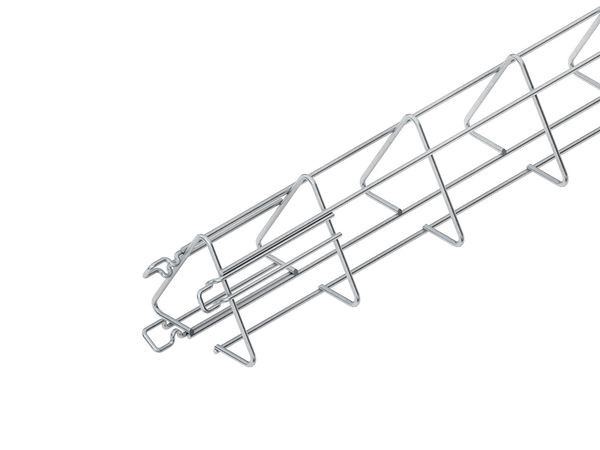 Gitterrinne nach DIN EN 61537, V-förmig, aus Stahldrähten, punktgeschweißt, zur Schnellbefestigung mit angeschweißten Stoßstellenverbindern an den trigonalen Seiten. Abmessungen (ca. Maße) Nennmaße Höhe H (außen) x Breite B (außen) : 80 x 80 mm Längsdraht-Ø : 3,9 mm Bodenlängsdrahtabstand : 29 mm Querdraht-Ø : 3,9 mm Querdrahtabstand : 100 mm Lieferlänge L : 3000 mm Nutzbarer Querschnitt : 1800 mm² Werkstoff : Stahl, galvanisch verzinkt nach DIN EN ISO 19598, blaupassiviert
