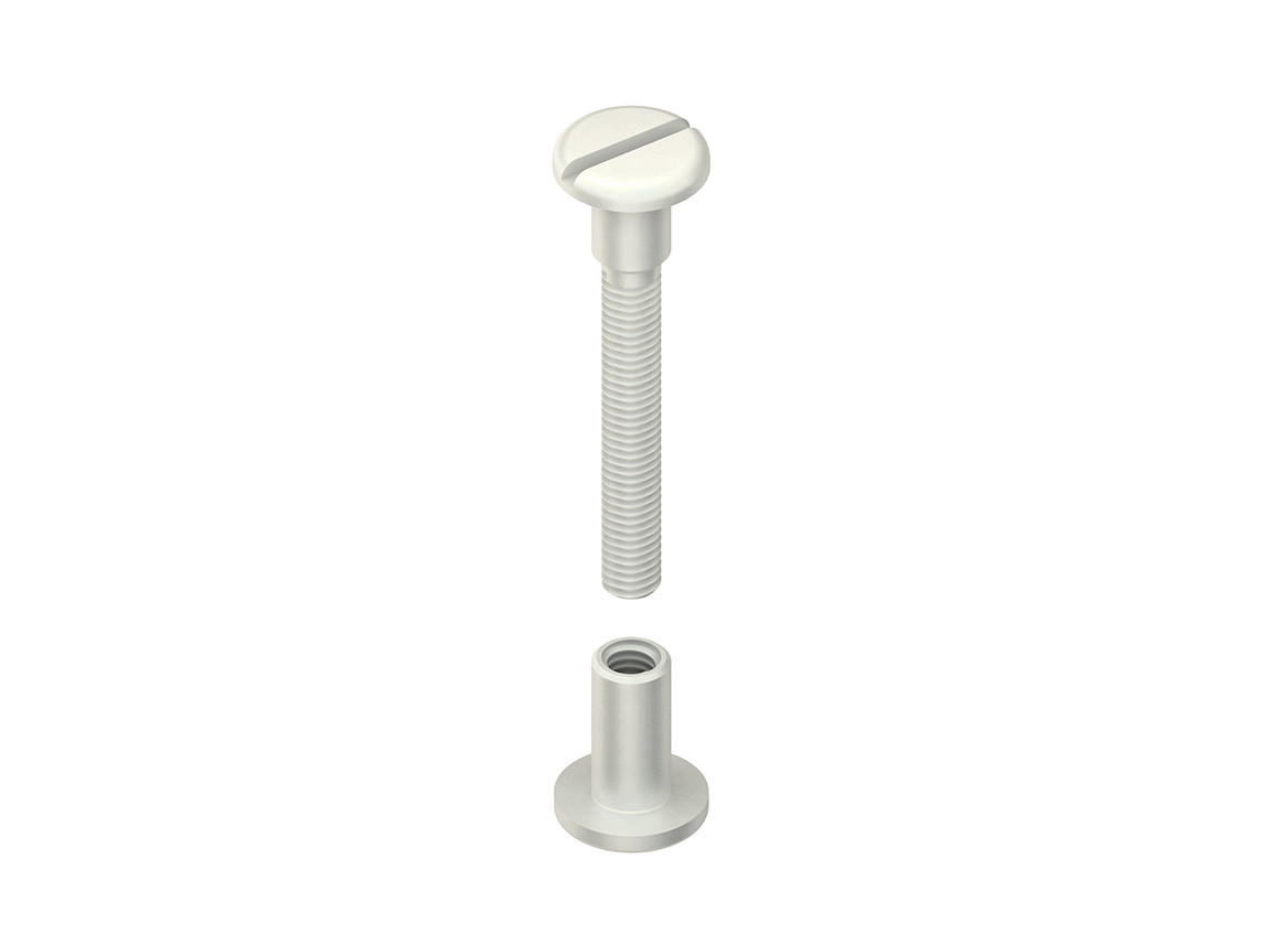 Kunststoffbolzen, Flachkopfschraube mit Schlitz, Schaft und Gewinde einschließlich Flachkopfhülse mit Schlitz und Innengewinde, zur Befestigung des GFK-Handlaufprofils auf dem GFK-Befestigungswinkel sowie zur Befestigung des GFK-Verbinders, halogenfrei. Verwendung für : GFK-Verbinder PR-MC10 GH, GFK-Wandbefestigungswinkel PR-MC 10 GM Abmessungen (ca. Maße) Schraubenlänge (Schaft und Gewinde) : 50 mm Schraubengewinde Außen-Ø : 6 mm Schaft-Ø : 8 mm Flachkopfhülse-Ø : 8 mm Flachkopfhülse Innengewindelänge : 16,5 mm Werkstoff : PA (Polyamid) Farbe : schwarz