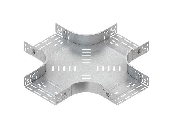 Kreuzung, für Kabelrinnen, steckbar mit der CITO Kabelrinne RLVC..., zur Herstellung von horizontalen 90° Kreuzungen, mit Rastschlaufen, zusätzlichen Verbinderlochungen, integriertem Stoßstellenverbinder und anteilmäßigem Befestigungszubehör. Zur Verwendung im Funktionserhalt bitte Zusatzvorschriften beachten! Verwendbar für : CITO Kabelrinne RLVC... und Kabelrinnen mit 60 mm Kantenhöhe Abmessungen (ca. Maße) H x B (lichtes InnenMaße) : 60 x 402 mm Innenholmradius R : 99 mm Werkstoff : Stahl, bandverzinkt nach DIN EN 10346