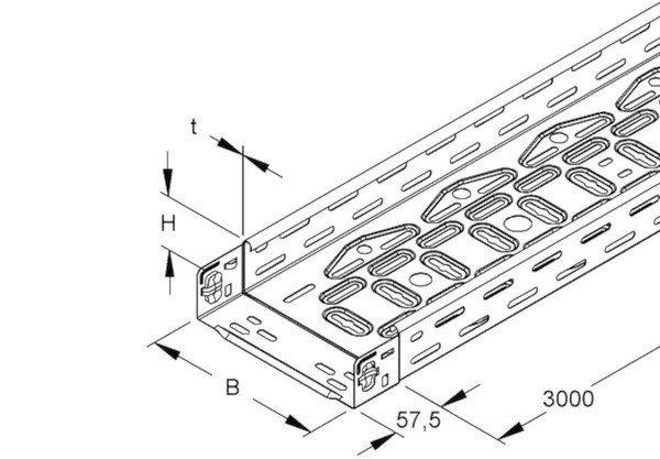 Kabelrinne, leicht, nach DIN EN 61537, mit angeprägtem Stoßstellenverbinder zur schraublosen Schnellbefestigung und mit versetzt angeordneter Boden- und Seitenperforation für stufenlose Befestigung und Anbringung der Systembauteile, Boden zusätzlich gesickt und mit durchgehend mittiger Schlüssellochperforation zur Abhängung mit Gewindestäben M 10/... versehen, zusätzlich ermöglicht eine 4-reihige aus der Mitte durchgehend symmetrisch angeordnete Bodenlochung die Aufnahme von Kabelverschraubungen, zwei ebenfalls symmetrisch im Boden eingebrachte Reihen von T-Auslässen ermöglichen eine Schnellbefestigung der Kabelbinder durch einschlaufen von oben (kein Fädelaufwand). VDE zertifiziert! Hergestellt mit 60% CO2-reduziertem Stahl! Abmessungen (ca. Maße) Höhe H x Breite B : 60 x 300 mm Materialstärke t : 0,75 mm Schlüssellochperforation : 7 x 40 mm und Ø 11 mm Abstand : 62,5 mm innere symmetrische Bodenlochreihe : Ø 20,5 mm und Ø 25,5 mm symmetrischer Abstand : 80 mm Abstand : 375 mm äußere symmetrische Bodenlochreihe : Ø 13,5 mm und Ø 16,5 mm symmetrischer Abstand : 245 mm Abstand : 125 mm T-Auslässe : 14 x 30 mm symmetrischer Abstand : 90 mm Abstand : 375 mm Lieferlänge L : 3000 mm Nutzbarer Querschnitt : 17800 mm² Werkstoff : Stahl, bandverzinkt nach DIN EN 10346