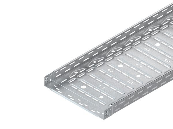 Kabelrinne, leicht, nach DIN EN 61537, mit angeprägtem Stoßstellenverbinder zur schraublosen Schnellbefestigung und mit versetzt angeordneter Boden- und Seitenperforation für stufenlose Befestigung und Anbringung der Systembauteile, Boden zusätzlich gesickt und mit durchgehend mittiger Schlüssellochperforation zur Abhängung mit Gewindestäben M 10/... versehen, zusätzlich ermöglicht eine 4-reihige aus der Mitte durchgehend symmetrisch angeordnete Bodenlochung die Aufnahme von Kabelverschraubungen, zwei ebenfalls symmetrisch im Boden eingebrachte Reihen von T-Auslässen ermöglichen eine Schnellbefestigung der Kabelbinder durch einschlaufen von oben (kein Fädelaufwand). Zur Verwendung im Funktionserhalt bitte Zusatzvorschriften beachten! Erforderliches Befestigungszubehör für den Funktionserhalt 4x FLM 6X12 bitte gesondert bestellen! VDE zertifiziert! Abmessungen (ca. Maße) H x B : 60 x 400 mm Materialstärke t : 0,9 mm Schlüssellochperforation : 7 x 40 mm und Ø 11 mm Abstand : 62,5 mm innere symmetrische Bodenlochreihe : Ø 20,5 mm und Ø 25,5 mm symmetrischer Abstand : 120 mm Abstand : 250 mm äußere symmetrische Bodenlochreihe : Ø 13,5 mm und Ø 16,5 mm symmetrischer Abstand : 345 mm Abstand : 125 mm T-Auslässe : 14 x 30 mm symmetrischer Abstand : 135 mm Abstand : 250 mm Lieferlänge L : 3000 mm Nutzbarer Querschnitt : 23800 mm² Werkstoff : Stahl, feuerverz. nach DIN EN ISO 1461