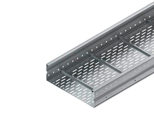 Weitspannkabelrinne nach DIN EN 61537, mit besonders stark ausgeprägten, durchgehend gelochten und gesickten Seitenholmen, sowie eingenietetem Boden mit versetzt angeordneter Perforation und gelochten Quersicken zur Stabilisierung und Trennstegbefestigung. Stoßstellenverbinder WSV 150.500 bitte gesondert bestellen. Abmessungen (ca. Maße) H x B : 150 x 200 mm Materialstärke : 2 mm Quersickenabstand : 300 mm Seitenholmlochung : 9,5 x 13 mm Lochabstand : 50 mm Lieferlänge : 6000 mm Nutzbarer Querschnitt : 24855 mm² Werkstoff : Stahl, tauchfeuerverzinkt nach DIN EN ISO 1461
