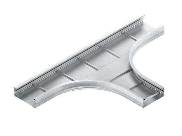 T-Stück, mit gesickten, runden und ungelochten Seitenholmen, mit Verbinderlochung für den Anschluss, formstabil durch den vollflächig eingenieteten, gesickten und ungelochten Boden, für Weitspannkabelrinnen, zur Herstellung von 90° T-Abgängen. Stoßstellenverbinder WSV 105.390 bitte gesondert bestellen. Die Formstückradien sind so ausgelegt, dass die Verlegung der Kabel gemäß DIN/VDE 0298 Teil 3 erfolgen kann. Stoßstellen müssen in unmittelbarer Nähe durch eine entsprechende Tragkonstruktion unterstützt werden. Verwendbar für : Weitspannkabelrinne WRL 105... Weitspannkabelrinne WRU 105... Abmessungen (ca. Maße) Höhe H x Breite B : 105 x 400 mm Länge in Hauptrichtung : 1500 mm + B Länge in Abgangsrichtung : 750 mm + B Innenholmradius R : 500 mm Werkstoff : Stahl, bandverzinkt nach DIN EN 10346
