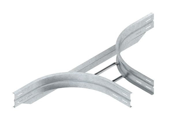 Anbau T-Stück, mit gesickten, runden und ungelochten Seitenholmen, mit Verbinderlochung für den Anschluss, mit integriertem Stoßstellenverbinder, für Weitspannkabelleiter, formstabil durch ein rückwärtig angebrachtes Stützprofil sowie durch eingenietete, nach oben offene C-Profilsprossen mit 16 mm Schlitzweite, zur kostengünstigen Herstellung von 90° T-Abgängen und Kreuzungen, breitenabhängig in der Hauptrichtung, einschließlich feuerverzinkten anteilmäßigem Befestigungszubehör. Die Formstückradien sind so ausgelegt, dass die Verlegung der Kabel gemäß DIN/VDE 0298 Teil 3 erfolgen kann. Passende Bügelschellen (B... und BK...) finden Sie im KI Katalog. Stoßstellen müssen in unmittelbarer Nähe durch eine entsprechende Tragkonstruktion unterstützt werden. Verwendbar für : Weitspannkabelleiter WSL 150... Weitspannkabelleiter WSLM 150... Abmessungen (ca. Maße) lichte Höhe H x lichte Breite B : 151,5 x 305 mm Ausklinkung der Weitspannkabelrinne : 1003 mm + B Länge in Abgangsrichtung : 750 mm Innenholmradius R : 500 mm Werkstoff : Stahl, tauchfeuerverzinkt nach DIN EN ISO 1461