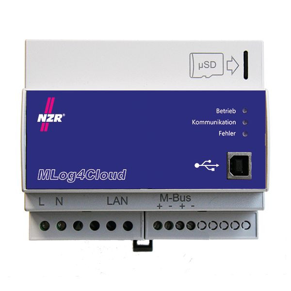Der MLog4Cloud M-Bus-Datenlogger bildet das Bindeglied zwischen Energiezählern und der CountVision Cloud. Das Gerät funktioniert ausschließlich mit der CountVision Cloud. Die Energiedaten werden per VPN über das Internet in die Cloud transportiert. Darin enthalten sind der NZR MLog4Cloud M-Bus Datenlogger zur gesicherten Netzwerk-Datenübertragung in die CountVision Cloud (Mess- und Übertragungsintervalle kundenseitig über Webinterface einstellbar), die datentechnische Einbindung des MLog4Cloud durch NZR auf dem CountVision Cloudsystem, die CountVision Lizenzierung ist separat für das spezifische Projekt festzulegen (separate Auftragsposition/Auftrag zur Lizenzierung), und eine Inbetriebnahme und Schulung am Gesamtsystem (Hardware und Cloud-Einweisung). Diese ist zwingend separat erforderlich und in Ihrem Budget einzuplanen. Der Zugang zur CountVision-Cloud erfordert den Abschluss eines Nutzungsvertrages zwischen NZR und dem Lizenznehmer (Endkunde). Bitte sprechen Sie uns bei Bedarf an. Das angeschlossene M-Bus Netzwerk wird vom Datenlogger zyklisch ausgelesen. Das Ausleseintervall ist für jeden Zähler parametrierbar (5/15/60Min./24Std.). Zur Parametrierung dient der interne Webserver. Die erfassten Daten werden als M-Bus Rohdaten inklusive Zeitstempel auf der µ-SD-Karte des Datenloggers abgelegt. Die spätere Interpretation der M-Bus Telegramme erfolgt ausschließlich innerhalb der CountVision Cloud. Es können bis zu 25 M-Buslasten angeschlossen werden. Nach der Interpretation der M-Bus Rohdaten steht der gesamte Inhalt des M-Bus Telegramms (RSP_UD2- Telegramm) zur Weiterverarbeitung zur Verfügung. Aus den einzelnen Zählerständen können Lastprofile und Energieverbrauch generiert werden. Zusätzlich kann über die USB- oder Ethernet-Schnittstelle jederzeit, wie bei einem Pegelwandler, direkt auf den M-Bus zugegriffen werden. Das Gerät wird mit einer 2GB Micro-SD Karte geliefert. Falls Sie nicht über eine CountVision-Cloud Registrierung verfügen, bestellen Sie bei uns Ihren exklusiven Zugang. Die Kosten hierfür hängen von den von Ihnen benötigten CountVision Elementen ab und können kurzfristig dazu gebucht werden. Weitere technische Daten Montage DIN-Hutschiene, Abmessungen B x H x T [mm] 106 x 90 x 62, Schutzklasse 2 (Schutzisolierung),Schutzart IP40 (nur bei Montage im Schaltschrank), Gewicht 0,2 kg, Temperatur Betrieb 0 bis 55°C, Temperatur Lagerung -20 bis 60°C, Feuchte (nicht kondensierend) 10-70%, Spannungsbereich 220 - 240 V (AC), Leistungsaufnahme MLogX (ausführungsabhängig) 3 bis 9 W, M-Bus Normbezug EN13757-2/3, Übertragungsrate M-Bus 300 / 2400 / 9600 Baud, maximale Anzahl Standardlasten 25 (mit je 1,5 mA)