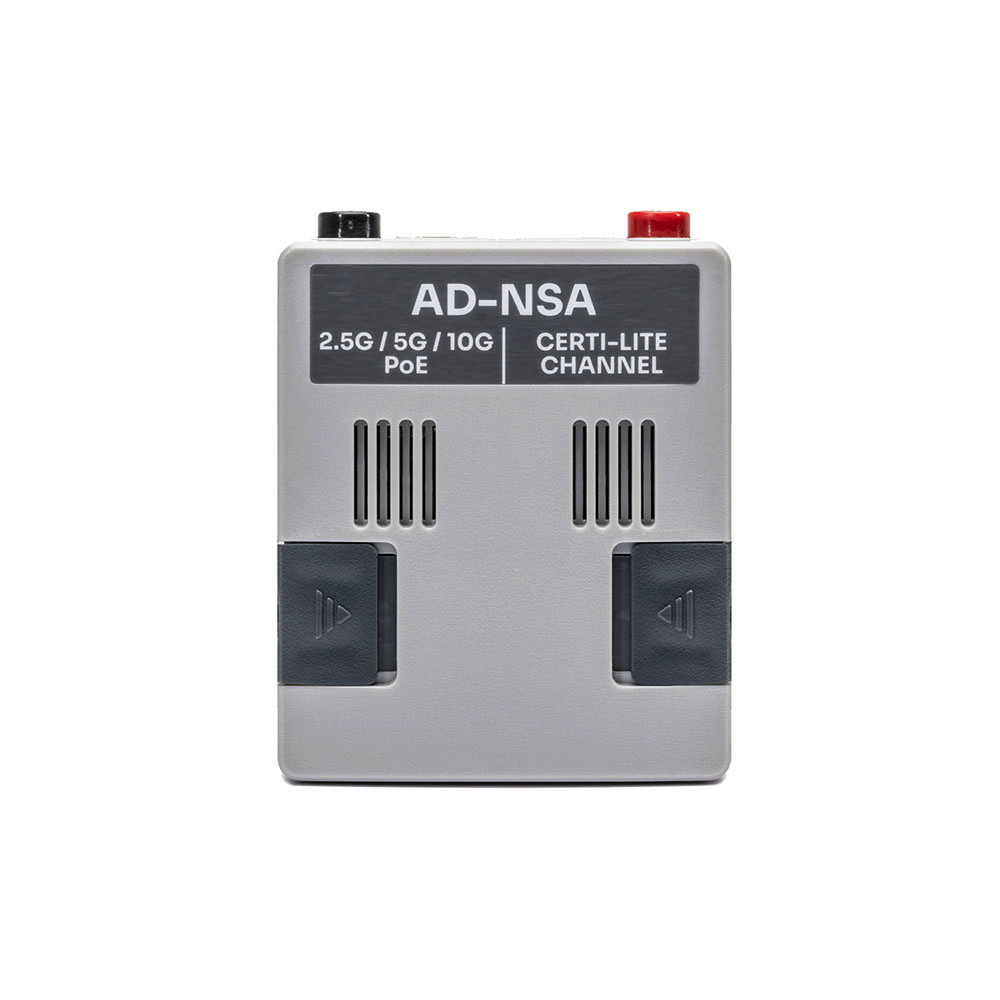 Der NSA-Adapter ermöglicht die Qualifizierung Certi-Lite von Twisted-Pair-Kupferverkabelung nach ANSI/TIA-1152-A Standard bis zu CAT6A mit Angabe des geeigneten Übertragungsstandards bis 10 Gbit/s. Es können PoE-Parameter wie PSE-Typ, DP-Klasse, Standard bis 802.3 bt (PoE++), UPoE, spannungsführende Paare etc. ermittelt werden. Ein PoE Lasttest mittels fein justierbarer, abgerufener Leistung ist ebenso verfügbar, wie ein externer Lasttest, bei dem bei aktivem PoE das Signal-Rauschverhältnis (SNR) und die Signalleistung überwacht wird. Der integrierte Multi-Gig-Test ermöglicht eine Validierung der Netzwerkgeschwindigkeit und Messung des SNR bei aktiver 1/2,5/5/10 GBASE-T Verbindung.