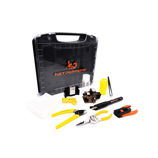 Der LWL-Werkzeugkoffer vereint alle Schritte zur Verarbeitung von Glasfasern in einem kompakten Set. Zu Abisolierung des Außenmantels von Drop- oder Mikro-/Mini-Einblaskabeln steht der Bündeladerschneider Miller MB06-7000 für Außenmanteldicken bis 6,4 mm und Längsschlitzfunktion zur Verfügung. Zur Abisolierung von 3 mm Schutzmantel und 900 ?m Sekundärcoating kommt eine bewährte Miller-Zange zum Einsatz. Zum Abmanteln des 250 ?m Primärcoatings kommt der NetPeppers OFS31 LWL-Präzisions-Abisolierer zum Einsatz. Neben einer Schere zum Entfernen des Kevlar-Geflechts finden sich auch Tücher und ein Alkohol-Druckspender im Lieferumfang, um die Faser vor dem Cleave-Vorgang mit dem bewährten NetPeppers OFC30 Cleaver zu reinigen. Für Sicherheit während der Verarbeitung sorgen eine Pinzette und ein endverschließbarer Abwurfbehälter für Faserreste. Am Ende des Konfektionierungsvorgangs kann die Installation mittels der VLP50 sichtbaren Laserlichtquelle auf Fehler geprüft werden, nachdem der fertige Fusionsspleiß mit Crimpspleißschutz und der enthaltenen TELENT-Spleißschutzpresse geschützt wurde.