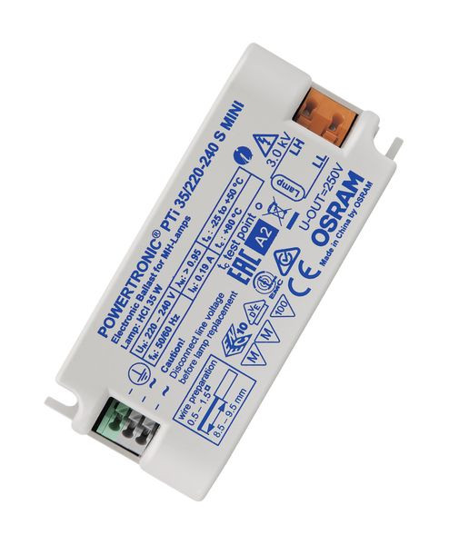 EVG für HID-Lampen, zum Leuchteneinbau. Produkteigenschaften: Energie-Effizienz-Index EEI: A2. Versorgungsspannung: 220…240 V. Netzfrequenz: 50…60 Hz. Funkentstörung: nach EN 55015/CISPR 15. Sicherheit: nach EN 61347-2-12. Netzstromoberwellen nach EN 61000-3-2. Immunität, Störfestigkeit nach EN 61547. Produktvorteile: Bewährte, lange Lebensdauer bei maximal zulässigen Temperaturen. Kompakte Abmessungen und geringes Gewicht für filigrane Leuchtendesigns. Ausgezeichnetes thermisches Verhalten ermöglicht sehr hohe Grenztemperaturen tc und ta. Automatische Sicherheitsabschaltung bei Lampendefekt und am Lampenlebensende (EoL). Anwendungsgebiete: Shopbeleuchtung. Wellnessbereiche (an trockenem, korrosionsgeschütztem Ort). Effekt- und Akzentbeleuchtung. Sicherheitshinweise: Thermisches Verhalten Durch die Verlustleistung des Vorschaltgerätes und die Wärmeentwicklung der Lampe kann es in einem geschlossenen Raum zu einem Wärmestau kommen. Deshalb ist es nötig sicherzustellen, dass auch unter ungünstigen Bedingungen die Temperatur am tc-Messpunkt des EVG nicht überschritten wird.. Achtung! Gemäß den Sicherheitsvorschriften ist das Gerät vor Lampenwechsel vom Netz zu trennen!. Leitende Materialien müssen 4 mm Mindestabstand von der Klemmleiste haben.. Installation nur durch qualifiziertes Fachpersonal.. Klemmen für Schutzleiter nicht für Durchverdrahtung geeignet..