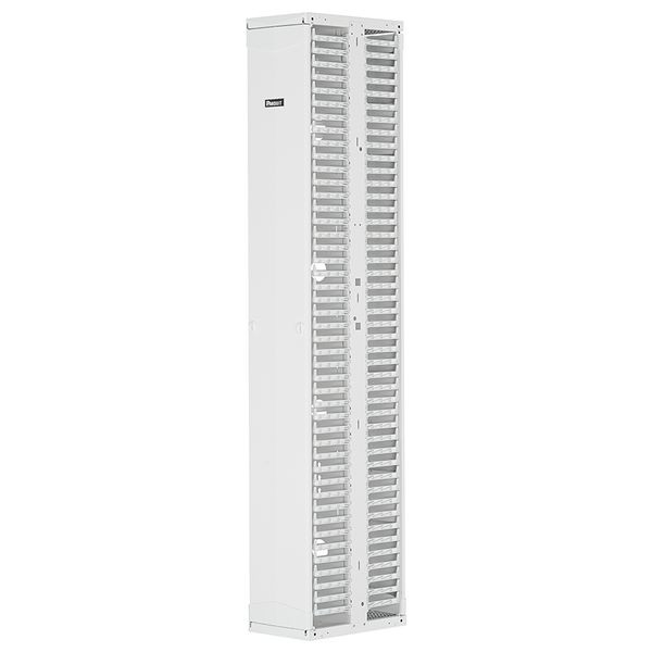 Die vertikale PatchRunner™ 2 Kabelführung verbindet hohe Dichte mit Vielseitigkeit und minimiert den Platzbedarf. Die vollständig vormontierte Kabelführung senkt die Gesamtkosten. Die Zweiseiten-Kabelführung hat einen Metall-Backbone mit aus Kunststoff vorgeformten Fingern; zwei Metalltüren voller Länge (2 Scharniere), die durch Zudrücken geschlossen werden. Die Führung ist 52 RU, 10 Zoll breit, Farbe Weiß.