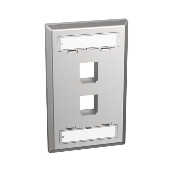 Die NetKey® Geräteblende nimmt zwei Keystone-Module auf. Einzelgruppen-Geräteblende umfasst Etikett und Etikett-Abdeckung und ist Edelstahl.