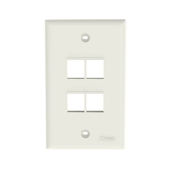 Die NetKey® Geräteblende nimmt vier Keystone-Module auf. Die Ein-Band-Geräteblende wird an einer NEMA-Standard-Ein-Band-Öffnung montiert. Die Geräteblende lässt sich mit einem selbstklebenden Etikett identifizieren und ist cremeweiß.