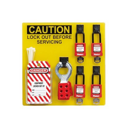 Verriegelungsstation mit Komponenten, 4 Personen. Enthaltene Komponenten: (4) PSL-8 rote nicht leitende Vorhängeschlösser (andere Schlüssel), (3) PSL-1.5 Verriegelungshaspen (15 Anhänger) PVT-98 Sicherheitsetiketten