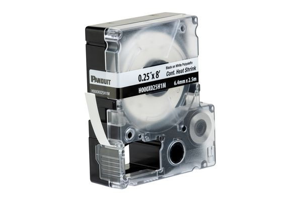 Die durchlaufenden Warmschrumpfetiketten in der Farbe Weiß des tragbaren Druckers bestehen aus Polyolefin nach militärischer Spezifikation. Ihre Abmessungen sind 0,13" (3,1 mm) Durchmesser, 8' (2,4 m) Länge und 0,25" (6,4 mm) Breite; der Kabelbereich ist 22–18 AWG. Die schnell ladende MP™-Etikettenkassette beinhaltet sowohl Etikettenmaterial als auch Band für das einfache Wechseln der Etiketten.