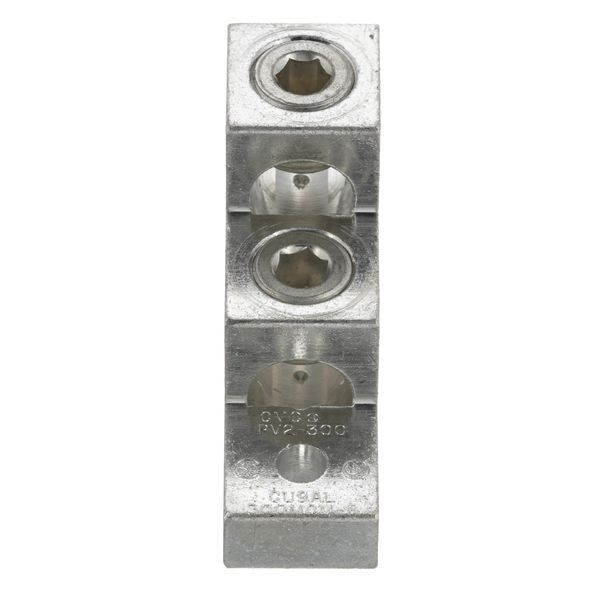 Ein Loch, Aluminium, Zweifach-Trommelkabelschuh vertikal, Dualbarrel, Typ LAM2SA, Nr. 6 AWG – 300 kcmil, Schraubloch 5/16 (7,9 mm).