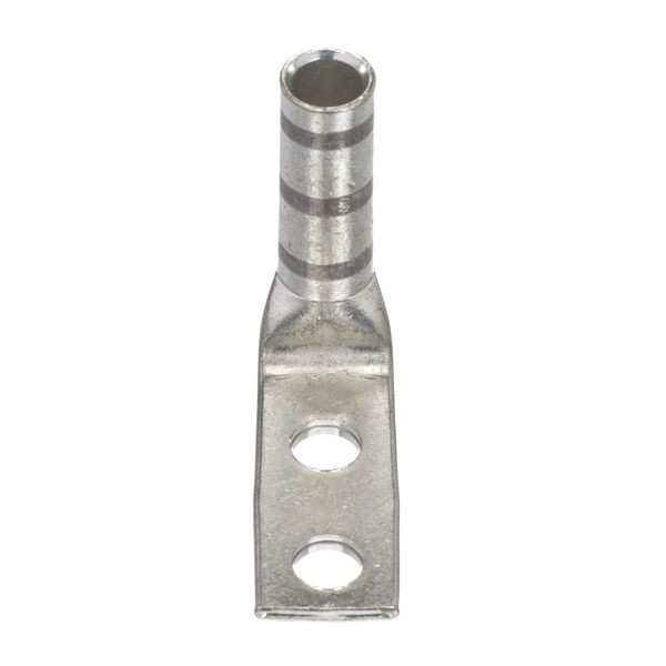 Zwei Löcher, flexible Hülse, langer Trommelkabelschuh, Kabel Nr. 4 AWG, Schraubloch 1/4, Lochabstand 0,63, Zunge 90-Grad-Winkel.