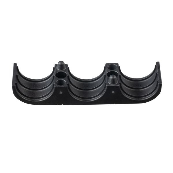 Panduit CLC100X3S8C370 is a 3-position half clamp that pairs with another to form a fully secured clamp used to secure 1" corrugated loom tubing. The pieces include ribbing to interface with the ridges of the corrugated loom tubing. These are made of heat-stabilized glass-filled nylon and are black in color. These are sold in packages of 100 pieces (bag contents provide 50 finished clamps).