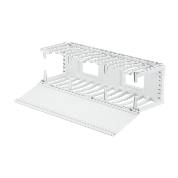 Die horizontale NetManager™ Kabelführung für hohe Kapazität organisiert und schützt kosteneffektiv Kupfer- und Glasfaserkabel in jedem standardmäßigen EIA 19" (483mm)-Rack oder Schrank. Große Öffnungen an den vorderen Fingern ermöglichen die komfortable Aufnahme von Kabeln der Kategorie 6 und 6A, wodurch sich Installationszeit und Instandhaltungskosten verringern lassen. Die Einseiten-Kabelführung ist 3 RU und verfügt nur über eine aufklappbare vordere Abdeckung. Die Führung ist weiß.