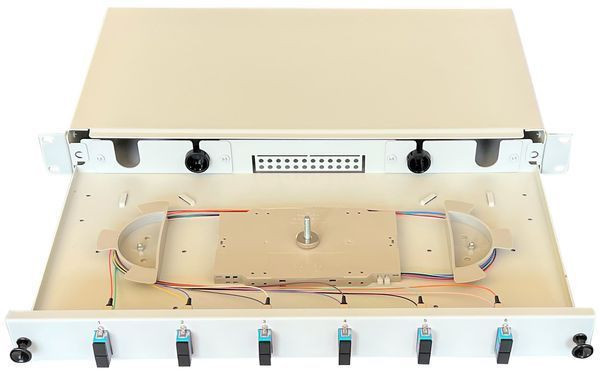 19" Spleissbox Multimode mit Frontblende, komplett spleissfertig vorbereitet mit 6x SCD-Kupplung Keramikhülse und 12x OM3 Pigtails farbig, mit Spleisskassette für Crimp-Spleissschutz, mit PG Verschraubung, ausziehbar