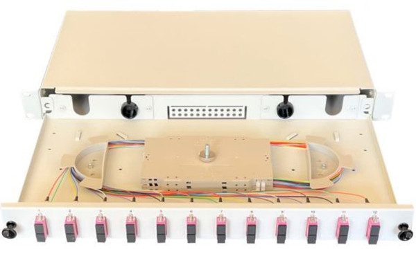 Vorderansicht - geöffnet 19" 1 HE Spleissbox für 12x SCd, 50/125µm OM4 Multimode, stufenlos ausziehbar (Prinzip Schubladentechnik), Stahlblech RAL7035 (lichtgrau), lackiert, komplett spleissfertig, tiefenverstellbar, ausklappbar, untere Ebene entnehmbar, Arretierung mittels Kunststoff-Schnellverschluss. Die Spleissbox ist ab Werk bestückt mit 12x SCd Kunststoffkupplungen, 24x SC/PC Faserpigtails 2.0m (semilos), 02x Standard-Spleisskassetten, 02x Spleisskämmen (Crimp), 02x M20-Kunststoff-Kabelverschraubungen, 02x Kabelspulen zur geordneten Faserführung, Kabelbinder und einem M6x18mm-Käfigmuttern-Set. Alle Faserpigtails sind standardmäßig spleissfertig eingelegt, abgesetzt, in der Spleisskassette beschriftet und geordnet auf den beiden Kabelspulen montiert. Die Kupplungen sind fest & sicher mit Schrauben fixiert. Zur Kabeleinführung befinden sich an der Rückseite 04x M20-Kabeleinführungen, davon 02x mit U-Ausbruch.