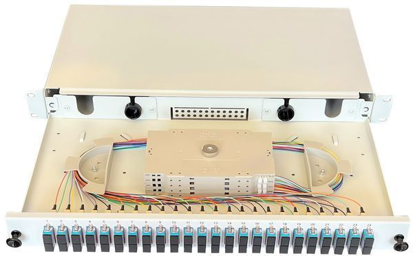 19" Spleissbox Multimode mit Frontblende, komplett spleissfertig vorbereitet mit 24x SCD-Kupplung Keramikhülse und 48x OM3 Pigtails farbig, mit Spleisskassette für Crimp-Spleissschutz, mit PG Verschraubung, ausziehbar