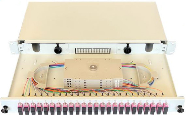 Vorderansicht - geöffnet 19" 1 HE Spleissbox für 24x SCd, 50/125µm OM4 Multimode, stufenlos ausziehbar (Prinzip Schubladentechnik), Stahlblech RAL7035 (lichtgrau), lackiert, komplett spleissfertig, tiefenverstellbar, ausklappbar, untere Ebene entnehmbar, Arretierung mittels Kunststoff-Schnellverschluss. Die Spleissbox ist ab Werk bestückt mit 24x SCd Kunststoffkupplungen, 48x SC/PC Faserpigtails 2.0m (semilos), 04x Standard-Spleisskassetten, 04x Spleisskämmen (Crimp), 02x M20-Kunststoff-Kabelverschraubungen, 02x Kabelspulen zur geordneten Faserführung, Kabelbinder und einem M6x18mm-Käfigmuttern-Set. Alle Faserpigtails sind standardmäßig spleissfertig eingelegt, abgesetzt, in der Spleisskassette beschriftet und geordnet auf den beiden Kabelspulen montiert. Die Kupplungen sind fest & sicher mit Schrauben fixiert. Zur Kabeleinführung befinden sich an der Rückseite 04x M20-Kabeleinführungen, davon 02x mit U-Ausbruch.