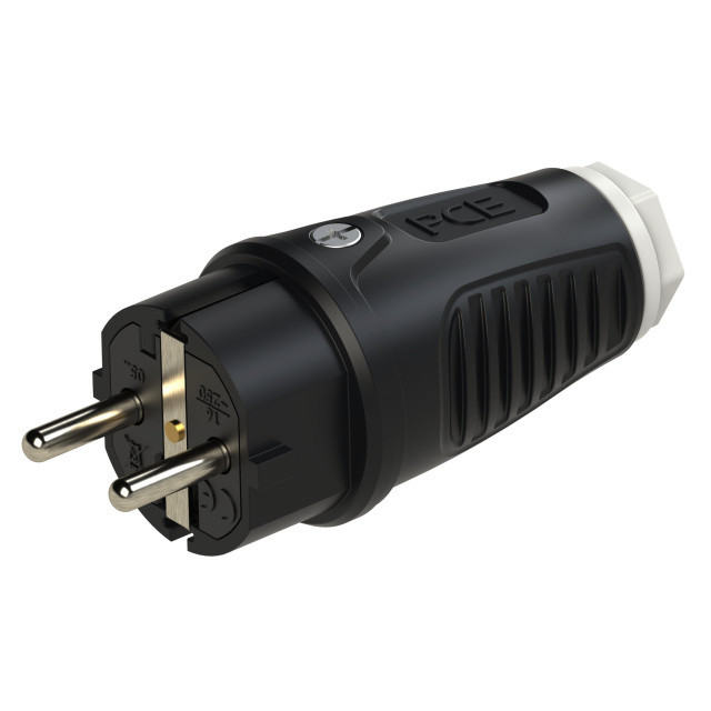 Schutzkontaktstecker Serie TAURUS2 - Vollgummi; Farbe (Haube/Ring): schwarz/weiß; Material (Haube/Kontaktträger): TPE/TPE; Schutzkontaktsystem: österr./deutsch ; 16A / 250V AC / 3p (2P+E), Schutzart: IP54