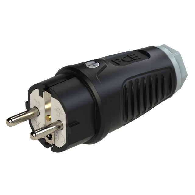 Schutzkontaktstecker Serie TAURUS2 - Gummi; Farbe (Haube/Ring): schwarz/dunkelgrau; Material (Haube/Kontaktträger): TPE/PA6; Schutzkontaktsystem: zweifaches Erdungssystem ; 16A / 250V AC / 3p (2P+E), Schutzart: IP54