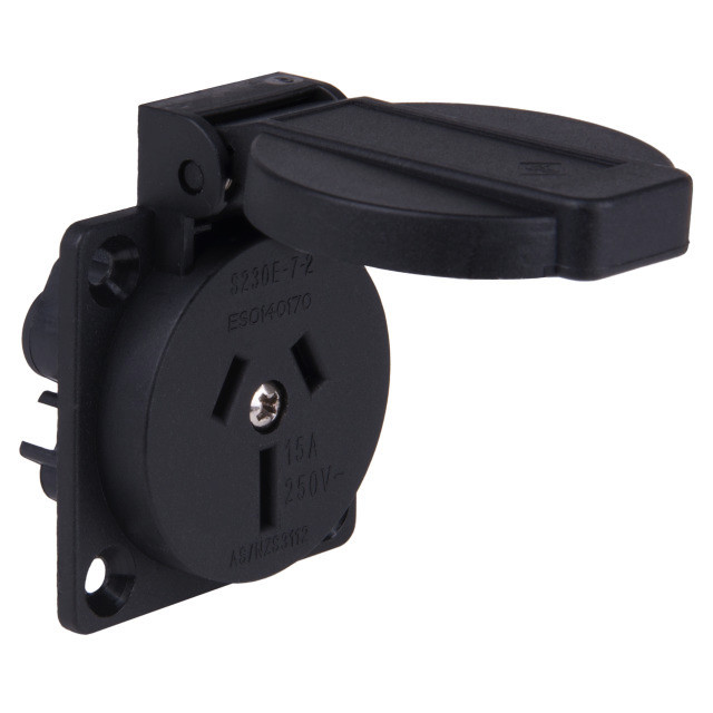 Anbausteckdosen AUS; System: Australisches System; Flanschgröße: 50x50; Gehäusematerial: PA6; Anschlusstechnik: Schraubkontakte rückwertig; Kontakte: vernickelte Kontakte; Farbe: schwarz; 15A, Schutzart: IP20