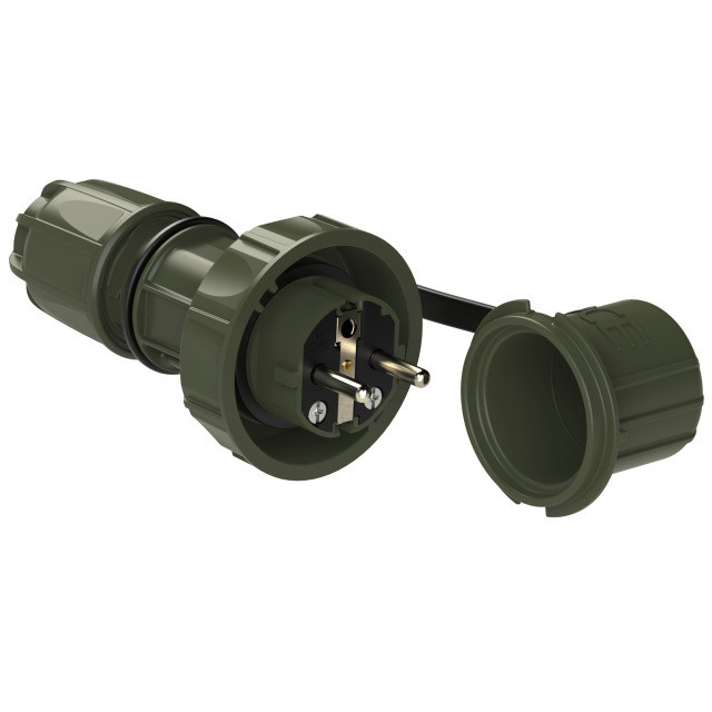 Schutzkontaktstecker mit Schutzkappe Serie NAUTILUS; Gehäusematerial: PC/ABS; Farbe: bronzegrün; Anschluss: Schraubklemme; System: 2-fach Schutzkontaktsystem (österr./deutsch und franz./belg.); Kontakte: vernickelt; 250V~ / 16A / 2P+E ; Schutzart: IP66/68 druckwasserdicht (2bar/2h) ; Verteidigungsgerätenorm VG96926: auf Anfrage