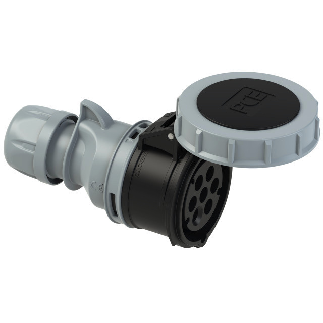 CEE-Kupplung 32A 7p 7h IP66/IP67 SHARK; Gehäusematerial: PA6; Nennstrom: 32A; Polzahl: 7 (6P+PE); Uhrzeit-Stellung: 7h; Nennspannung/Frequenz: 480-500V~ / 50+60Hz; Kontakte: Messing vernickelt; Anschlusstechnik: Schraubklemmen; Schutzart: IP66/IP67