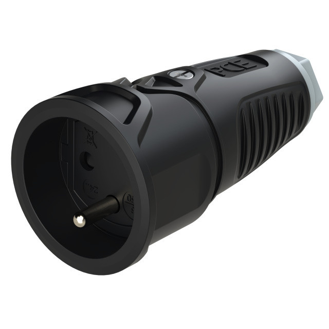 Schutzkontaktkupplung Serie TAURUS2 - Gummi; Farbe (Haube/Ring): schwarz/grau; Material (Haube/Kontaktträger): TPE/PA6; Schutzkontaktsystem: franz./belg. mit Shutter; 16A / 250V AC / 3p (2P+E), Schutzart: IP20