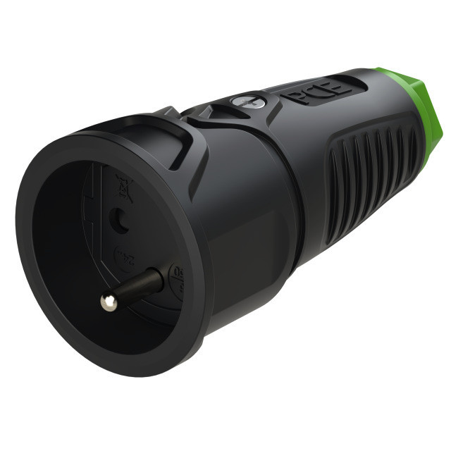 Schutzkontaktkupplung Serie TAURUS2 - Gummi; Farbe (Haube/Ring): schwarz/grün; Material (Haube/Kontaktträger): TPE/PA6; Schutzkontaktsystem: franz./belg. mit Shutter; 16A / 250V AC / 3p (2P+E), Schutzart: IP20