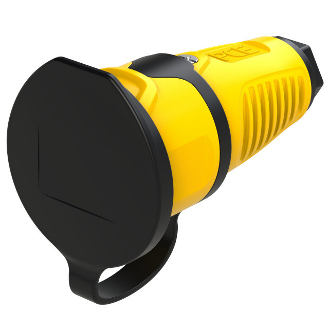 Schutzkontaktkupplung Serie TAURUS2 - Gummi mit Deckelband; Farbe (Haube/Ring/Deckel): gelb/schwarz/schwarz; Material (Haube/Kontaktträger): TPE/PA6; Schutzkontaktsystem: franz./belg. ; 16A / 250V AC / 3p (2P+E), Schutzart: IP54