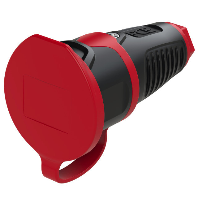Schutzkontaktkupplung Serie TAURUS2 - Gummi mit Deckelband; Farbe (Haube/Ring/Deckel): schwarz/rot/rot; Material (Haube/Kontaktträger): TPE/PA6; Schutzkontaktsystem: franz./belg. ; 16A / 250V AC / 3p (2P+E), Schutzart: IP54